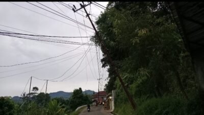 BOGOR | Keselamatan pengguna jalan di Kampung Situhiang, Desa Curug Bitung, Kecamatan Nanggung, Kabupaten Bogor, terus terancam. Ancaman itu berasal dari sebuah tiang listrik yang miring cukup parah, menyebabkan kabel-kabel listrik di atasnya kendur dan mengganggu ruang bebas kendaraan.