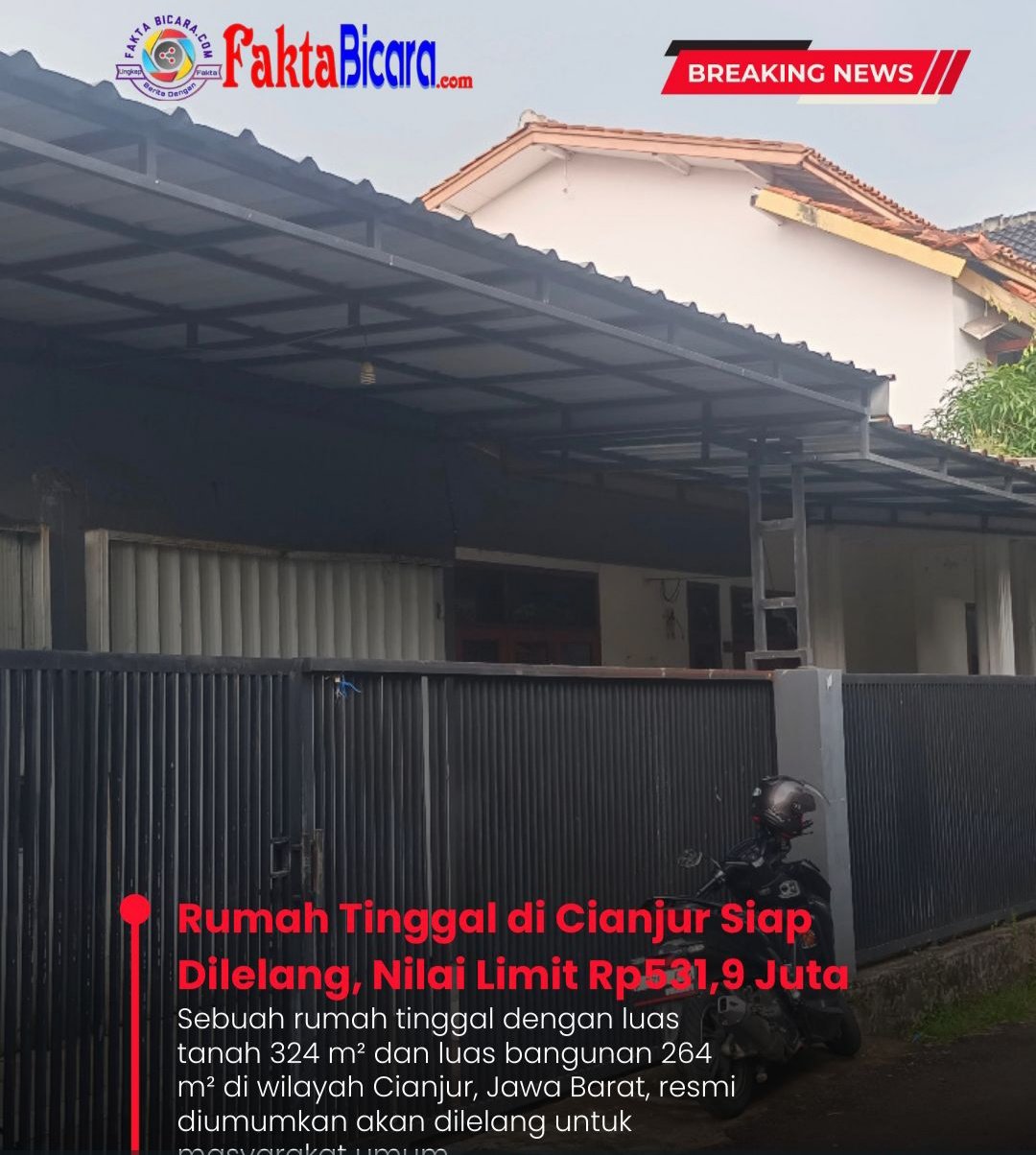 CIANJUR | FAKTA BICRA |[ Sebuah rumah tinggal dengan luas tanah 324 m² dan luas bangunan 264 m² di wilayah Cianjur,Jawa Barat,resmi diumumkan akan dilelang untuk masyarakat umum.Properti tersebut merupakan agunan kredit yang telah masuk kategori pembiayaan macet,dan pemilik jaminan telah memberikan persetujuan penuh untuk dilakukan penjualan melalui mekanisme lelang resmi.