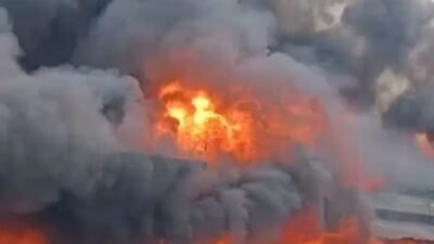Kobaran api dilaporkan melahap hampir seluruh bangunan lapak yang terbakar, sementara kepulan asap hitam terlihat dari jarak jauh.
