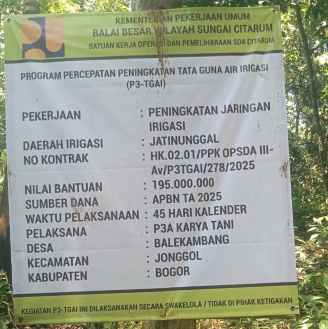 BOGOR | FAKTA BICARA.COM | Pembangunan irigasi Program Percepatan Peningkatan Tata Guna Air Irigasi (P3-TGAI) Tahun 2025 di Desa Balekambang Kecamatan Jonggol Kabupaten Bogor disoroti warga.